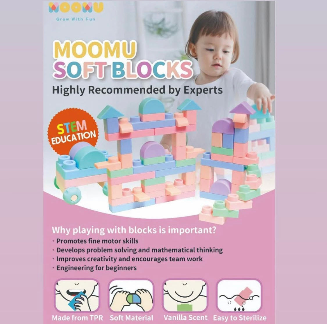 - FUN & EDUCATIONAL: Get kids' creativity flowing by playing with blocks! A great Montessori learning tool that introduces children to six shapes and five warm, creamy macaron-like colors: pink, purple, green, blue, and light orange. It also develops kids' fine motor skills as well as hand-eye coordination. Let these soft MOOMU blocks be your little one's first preschool educational toy!